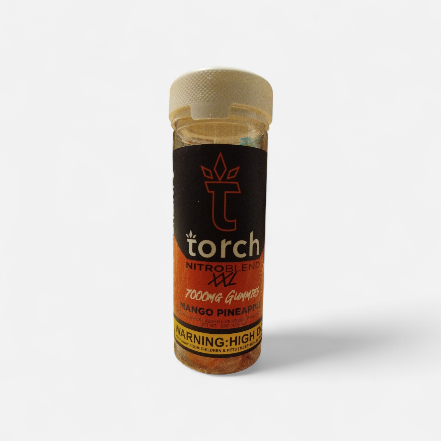 Cada frasco contiene 20 golosinas gourmet del tamaño de un bocado infusionadas con 350 mg de su mezcla patentada Nitro, compuesta por THC-P y HHC-P, para un total de 7000 mg por frasco. Estas gomitas Torch son veganas y están elaboradas con extracto de resina viva, lo que proporciona una experiencia más fuerte e intensa al ofrecer un espectro más amplio de cannabinoides.